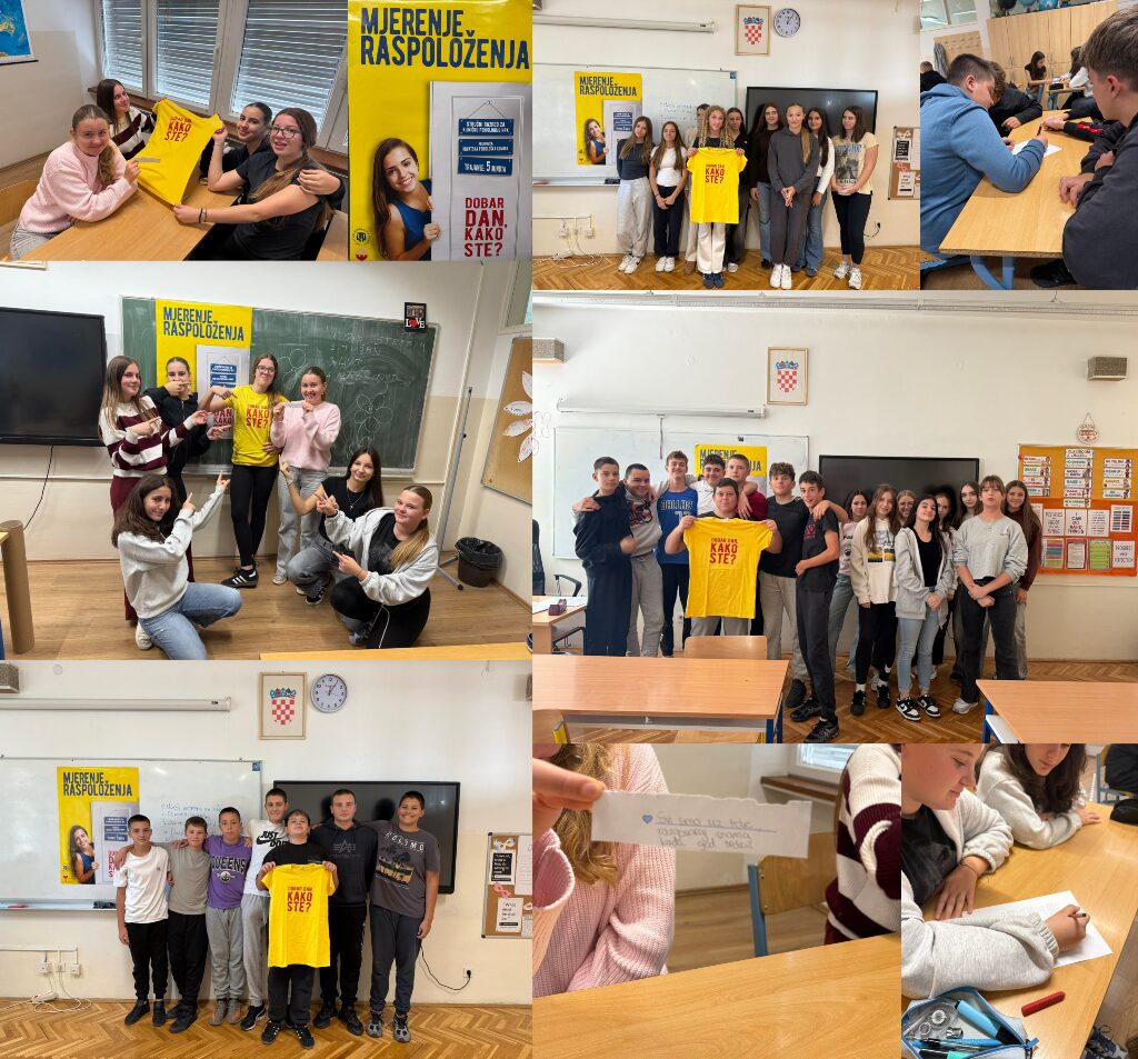 Povodom Svjetskog dana mentalnog zdravlja (10. listopada) naši učenici 8.c, 8.d i 8.e razreda sudjelovali su u aktivnosti “Dobar dan, kako ste?” u organizaciji naše školske psihologinje Sumejje Brković i školske pedagoginje Mire Šejtanić u suradnji s Hrvatskom psihološkom komorom.