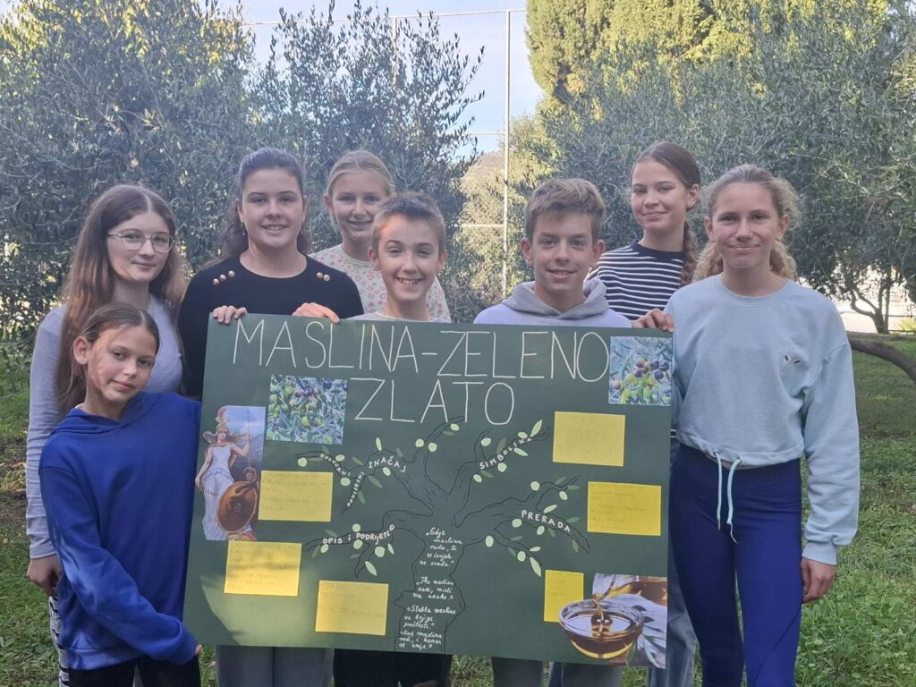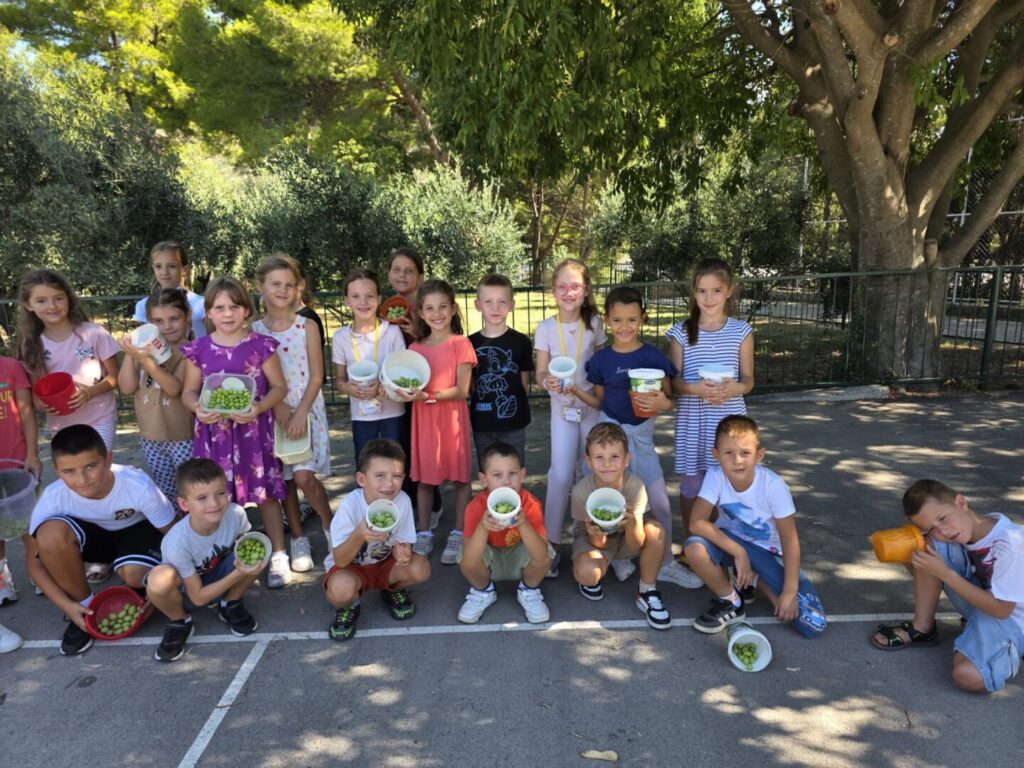 Mali (i malo veći) maslinari udružili su snage i uspješno priveli kraju jos jednu berbu maslina. Berba maslina i rad u masliniku već više godina povezuje generacije naših učenika. Osim malih maslinara (1. i 3. razred s voditeljicom Ivanom Matijević), dali su ruke i osmaši (8.c s voditeljicom Fany Bilić), te članovi EcoEnglish grupe (6. i 7. razred, s voditeljicom Robertom Skvrce). Na ovaj način gajimo ljubav prema prirodi i čuvamo tradiciju našeg kraja, a družeći se i surađujući učimo za budućnost. Nadisali smo se čistog zraka, zabavili se i stvorili uspomene za cijeli zivot. A kad smo završili berbu i dali samljeti masline, nepca smo obradovali degustirajući plodove svoga rada. Zelene masline još stoje u morskoj vodi i čekaju trenutak za probavanje.